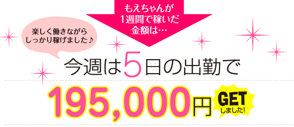 もえ/んー、けっこう1日のお給料がバラバラなんですよね♪でも、平均すると、1回の出勤で、だいたい4~5万円くらいって感じです★時間が空いた日とかにちょっとだけ入るだけでも2~3万円はもらえますね♪